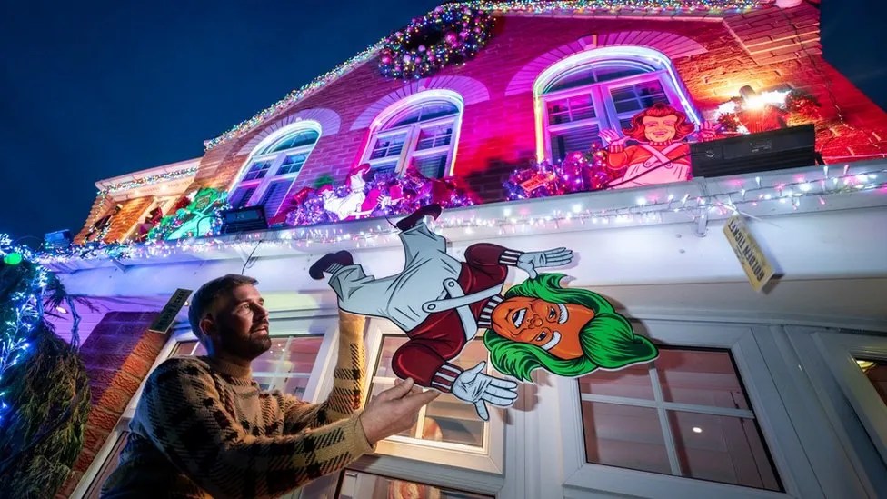 Una pareja gay ha convertido su casa en un país de las maravillas festivo con la temática de Willy Wonka en un intento por “difundir alegría y alegría” esta Navidad.