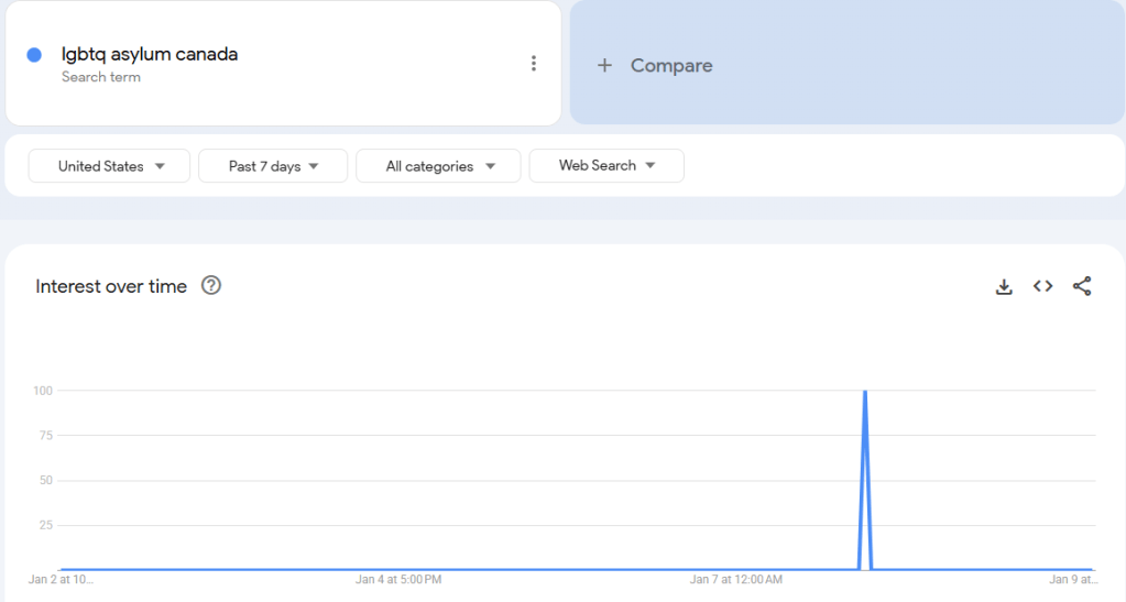 En este contexto, ha habido un aumento en las búsquedas en Google del término “asilo LGBTQ+ Canadá”, similar a un aumento anterior en 2025 que comenzó a aparecer por primera vez el 20 de enero: el día de la toma de posesión de Trump.